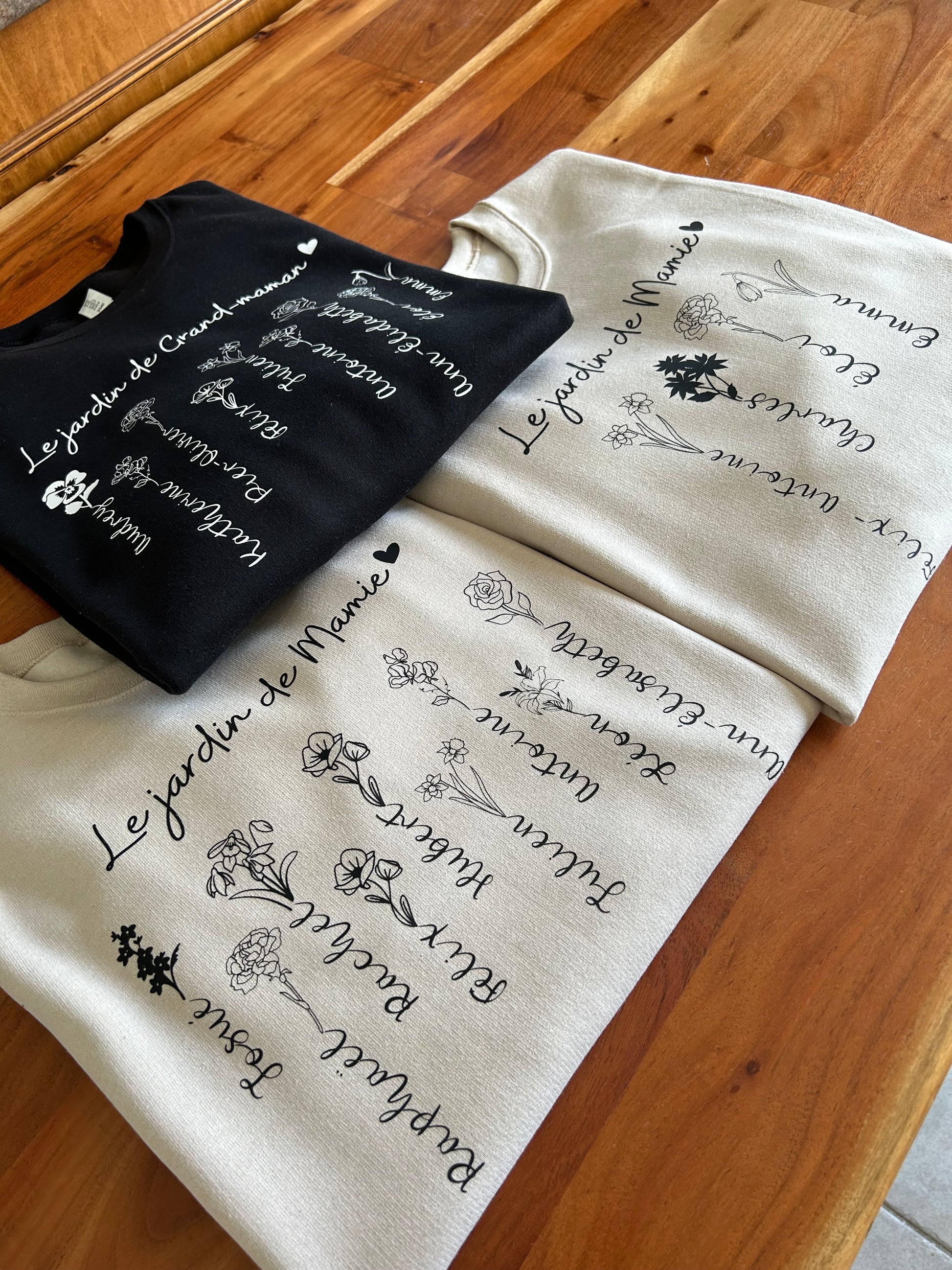 Voici le chandail crewneck manche longue sans capuche « Le jardin de Maman, Mamie, Grand-maman, Tatie, etc. ». Chaque prénom est associé avec la fleur de son mois de naissance.
